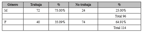 Dentro de la característica laboral, el 53.33% de la muestra labora, mientras que el 46.67% no. Por consiguiente, dentro del género masculino el 75.00% trabaja y el 25.00% no. Dentro del género femenino el 35.09% trabaja mientras que el 64.91% no. Así como señala la tabla 2.