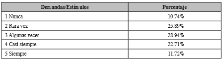 La tercera sección cuenta con 8 ítems, con un modelo de marcaje de respuestas modelo Lickert, en la que las opciones de respuestas oscilan en un rango de 1 a 5, en la que 1 representa nunca, 2 representa rara vez, 3 representa algunas veces, 4 representa casi siempre y 5 representa siempre. Esta sección permite identificar las demandas externas y su valorización como estímulos estresores.