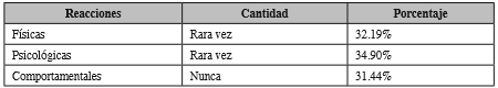 En el nivel de las reacciones físicas, psicológicas y comportamentales, la de mayor incidencia es la reacción psicológica, en la que la ansiedad, angustia o desesperación, concentración e inquietud son las más puntuadas con un 34.90%. Las reacciones físicas ocupan un segundo lugar con un puntaje digno de atención de 32.19%, en la que las características físicas más comunes son: cansancio permanente, somnolencia o mayor necesidad de dormir, dolores de cabeza o migrañas. Por último, dentro de esta sección el factor comportamental tiene un puntaje del 31.44 %, por lo que los factores más relevantes son los conflictos o discusiones de pares y desgano para realizar las labores académicas.