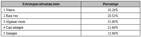 La última sección, la número 5, muestra el mecanismo de afrontamiento que realizan los estudiantes para hacer frente al fenómeno, para el ello el 31.60% de los encuestados indicaron que este elemento se presenta en un nivel que algunas ocasiones es repetido. Tal como señala la tabla 7.
