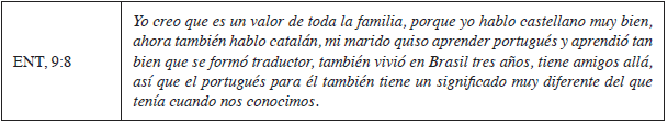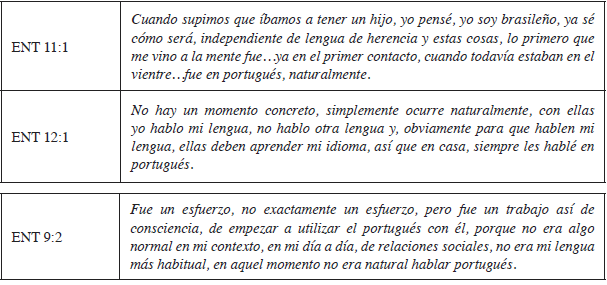 Por esta razón, los entrevistados consideran positivo el apoyo de la pareja no brasileña en la transmisión de la lengua de herencia, afirmando que el hecho de que el familiar no brasileño al menos comprenda el portugués, posibilita la creación de un contexto lingüístico en el que se favorece la comunicación en más de un idioma dentro de casa, creando un contexto de diversidad lingüística que proporciona también el desarrollo de la lengua de herencia.