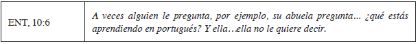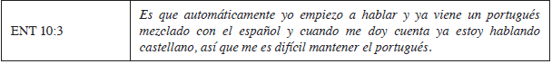 En este caso, se denota un conflicto relacionado con la creencia de Impacto citada por De Houwer (1999). Para esta situación, sería necesario ofrecer orientación respecto a propuestas alternativas de usos del portugués en algunos momentos clave para facilitar la organización mental del niño.