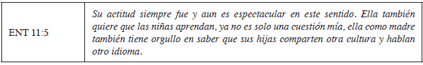 No obstante, en el caso de este alumno, esta relación entre dominio y preferencia se denota porque el familiar no suele hablar en portugués. La adquisición temprana no se llevó a cabo como en el caso de los niños de lengua materna, de manera que este alumno es bilingüe pasivo, es decir, comprende el idioma, pero no se expresa verbalmente en esta lengua. Asimismo, no se trata solamente de preferencia lingüística como menciona el familiar, sino que el alumno no tiene las herramientas básicas para expresarse oralmente en portugués.