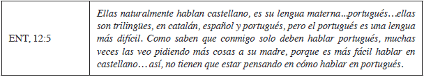 Corroborando los estudios de Broeder y Mijares (2003), otros familiares revelan que las lenguas preferidas de sus hijos son diferentes al portugués y esto ocurre en función de la dificultad que representa el portugués en un contexto exolingüe. Uno de los familiares también declaró que su hijo prefiere no utilizar el portugués:
