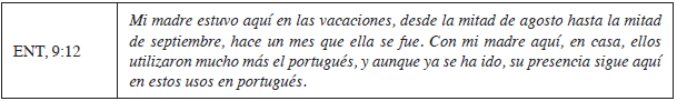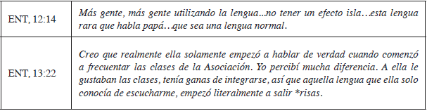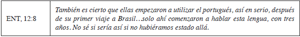 De acuerdo con las familias, las visitas de los familiares brasileños son importantes para el incremento en la cantidad y calidad del uso de esta lengua, como se observa en la siguiente cita: