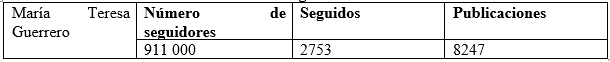 Análisis de contenido: Según Alianzo Ranking, María Teresa Guerrero es quien lidera la lista de los instagramers con mayor número de seguidores y actividad en la red social en mención. Cuenta con un total de 911 000 seguidores, 2753 seguidos y 8247 publicaciones. El tema principal en su perfil de Instagram es su día a día en EE.UU.