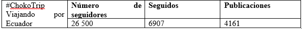 Lenguaje: En las diferentes publicaciones de chokoec se puede evidenciar que el lenguaje empleado es bastante entendible para los públicos que lo siguen, de manera especial para los amantes de viajes y aventuras. En sus publicaciones utiliza hashtags en los cuales se auto-menciona #ChokoTrip y también alude hacia el país que se encuentra visitando.