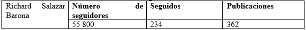 Análisis de contenido: El caso de Richard Salazar Barona se puede observar que su público objetivo, son adolescentes y es por ello que sus publicaciones se fundamentan en fotografías de sí mismo, en muchos casos tratándose de selfies en los cuales aparece muy atractivo con ropa bastante juvenil. En las publicaciones muestra su día a día y transmite cariño, amor y empatía hacia sus seguidoras, quienes en la mayoría son mujeres.