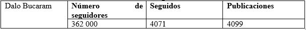 Lenguaje: A través de las publicaciones de Dalo Bucaram es muy notorio darse cuenta que es una persona muy amante a su familia y creyente en Dios, ello se puede evidenciar por los hashtags que emplea en sus publicaciones tales como #fuerzayFe, #lafuerzadelamor.