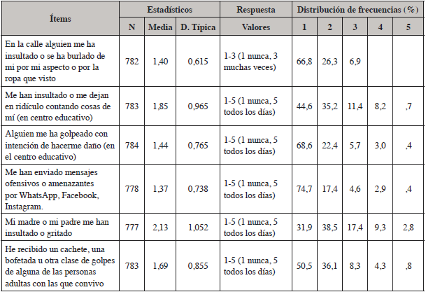 Se ha trabajado un núcleo de ítems relacionados con distintas manifestaciones de la violencia interpersonal. Se han estudiado formas de agresión verbal en el espacio público, en el entorno educativo y el acoso y agresión no presencial en entornos digitales. Salvo el primero de ellos, donde las opciones de respuesta posible eran tres, el resto se podían responder a través de una escala de 5 puntos, tal y como se describe con detalle a continuación en la Tabla 1. No se ha renunciado a medidas agregadas más complejas, ya que además de un análisis descriptivo independiente para cada variable se ha procedido a calcular un índice compuesto para el conjunto de los ítems reseñados, así como un contador de formas que violencia que clasifica a los individuos en función de su exposición a las variantes de la violencia interpersonal a las que apunta cada ítem. A continuación, desglosamos los principales resultados del análisis.