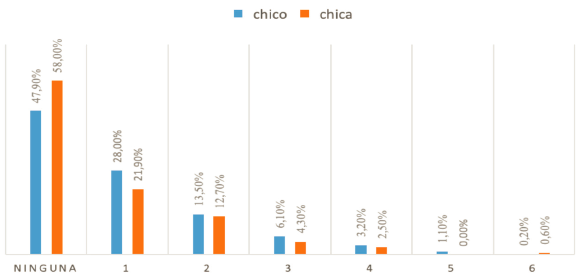 En concreto, el Gráfico 1 muestra ya al inicio una menor incidencia de la violencia entre las chicas (58% dicen no haberla sufrido nunca) que entre los chicos (47,9%). Esta desproporción fluctuará conforme nos desplacemos hacia el extremo y encontremos individuos que afirman sufrir diferentes manifestaciones de la violencia (hasta acumular las 6 posibles formas descritas en el estudio) pero en la práctica totalidad de los casos los varones parecen estar más expuestos a la misma, con la salvedad (que engloba en realidad a muy pocos individuos) del punto más extremo de la distribución.