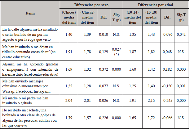 Algunos de los contrastes sombreados lo son en un sentido marginal por encontrarse el valor p más próximo a 0,05: caso de la pequeña diferencia encontrada por sexo en la puntuación de chicos y chicas al responder sobre las agresiones verbales en su centro educativo, pero también de la diferencia encontrada entre los dos grupos de edad en lo referente a las agresiones verbales en el espacio público de la calle. El resto nos hacen entender que las grandes diferencias se concentran en entender que los chicos parecen estar sensiblemente más expuestos a diversas formas de violencia física y también que la exposición a esta violencia física decrece conforme aumenta la edad. Con la edad, sin embargo, también se hacen más presentes otros tipos de agresiones.