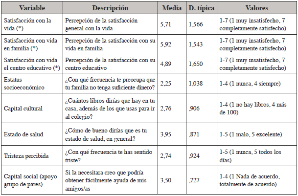Hemos introducido en el análisis nuevas variables explicativas que puedan dar cuenta tanto de aspectos relevantes del bienestar subjetivo de los y las adolescentes (Satisfacción con la vida, con la familia y con su vida en el centro educativo) como indicadores de su situación socioeconómica y capital social y cultural y otros valores que describen su estado de salud y autoconcepto.