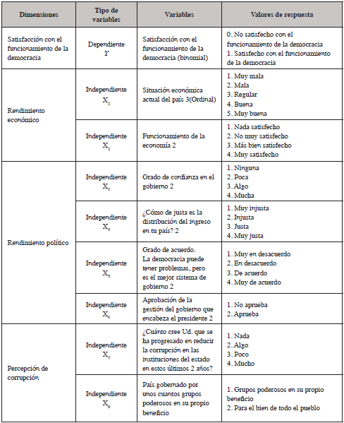A partir de nuestro objetivo “analizar cómo los factores de rendimiento económico, unido a los factores de rendimiento político y la percepción de corrupción, explican la satisfacción o insatisfacción con el funcionamiento de la democracia en Latinoamérica” las tres dimensiones: rendimiento económico, rendimiento político y percepción de corrupción; la variable dependiente fue la satisfacción con la democracia.