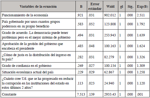 En el cuadro 2, están los resultados del modelo logístico, como se observa los Exp(B) están en un intervalo de confianza del 95%, mayores a uno, todos con signo positivo, y significativos (p<.00). Los resultados están ordenados de mayor a menor peso, en cuanto a la probabilidad de sentirse satisfecho (1) o no satisfecho (0) con el funcionamiento de la democracia en Latinoamérica. Las variables con mayor peso son las que integran la dimensión del rendimiento económico. Por una parte, el funcionamiento de la economía, es la más relevante, aumenta en 2511 veces la probabilidad de estar satisfecho con el funcionamiento de la democracia. En ese mismo sentido, la percepción de mejor situación económica actual del país aumenta en 1258 veces la probabilidad de estar satisfecho.