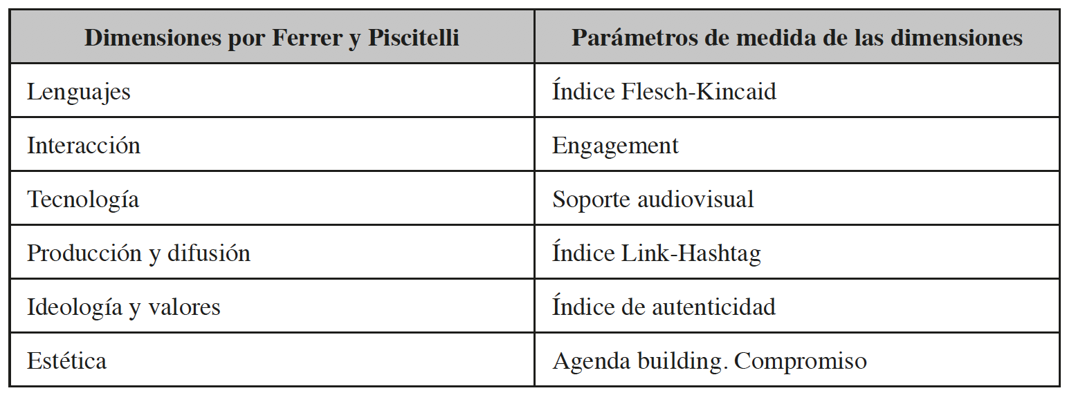 Con el modelo de estudio de la competencia mediática diseñado en esta investigación, los parámetros que medimos fueron los de: índice Flesch-Kincaid, para analizar la dimensión de lenguajes; el engagement, para la dimensión de interacción; el soporte audiovisual, para la de tecnología; el índice link-hashtag, para la de producción y difusión; el índice de autenticidad, para la de ideología y valores; y finalmente, la agenda building, para la de ética.