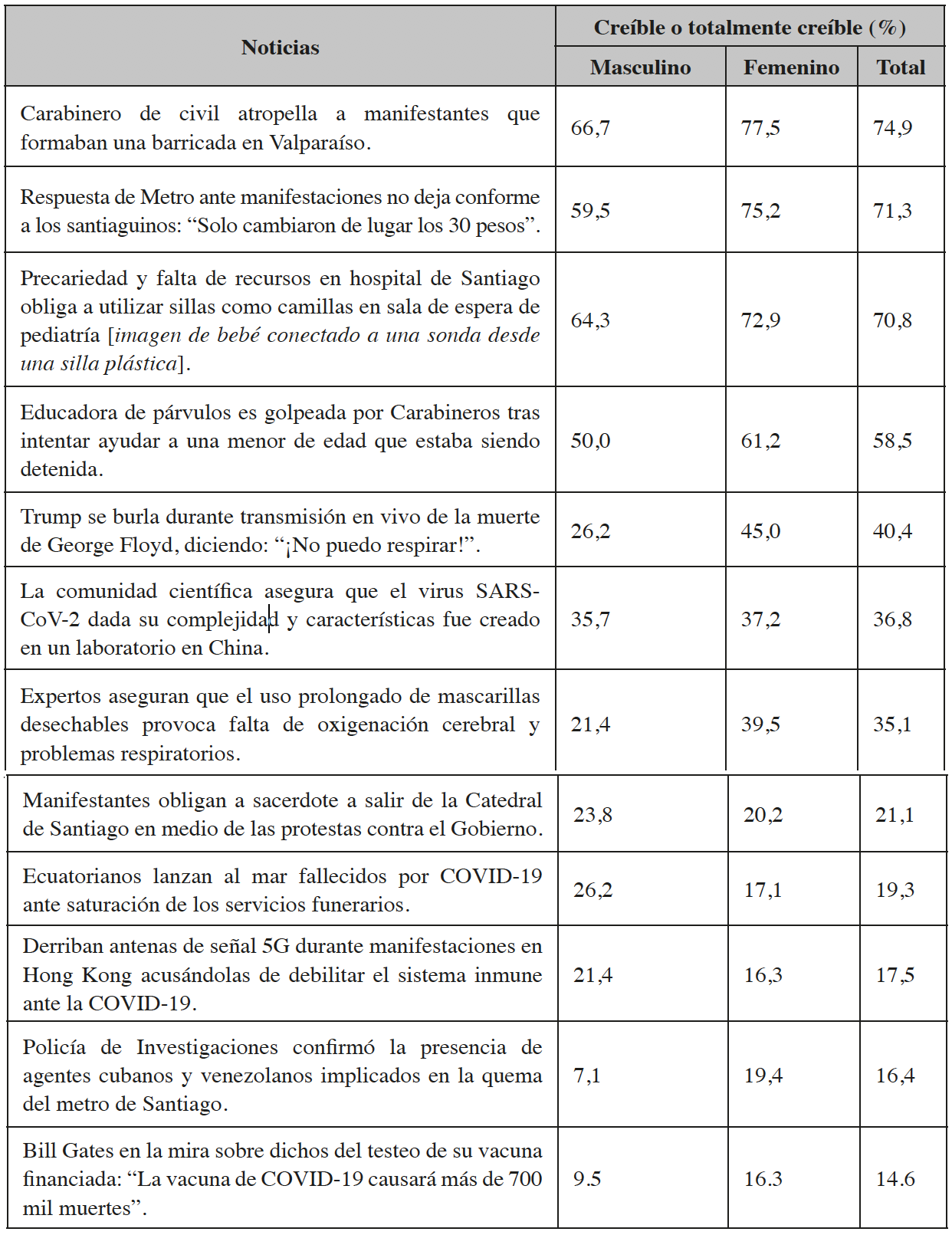 Al desagregar el análisis con base al género de los participantes se encontró que en nueve de las doce noticias falsas las mujeres reportaron una mayor credibilidad que los hombres, así, por ejemplo, mientras que un 26% de los hombres consideró muy o totalmente creíble que Donald Trump se haya mofado de la muerte del ciudadano George Floyd, en las mujeres esta cifra ascendió a un 45%. De igual forma, se observó que la credibilidad en la noticia que afirmaba la presencia de agentes externos en la quema del metro de Santiago representa para el grupo de mujeres el triple de la credibilidad que le conceden los hombres.