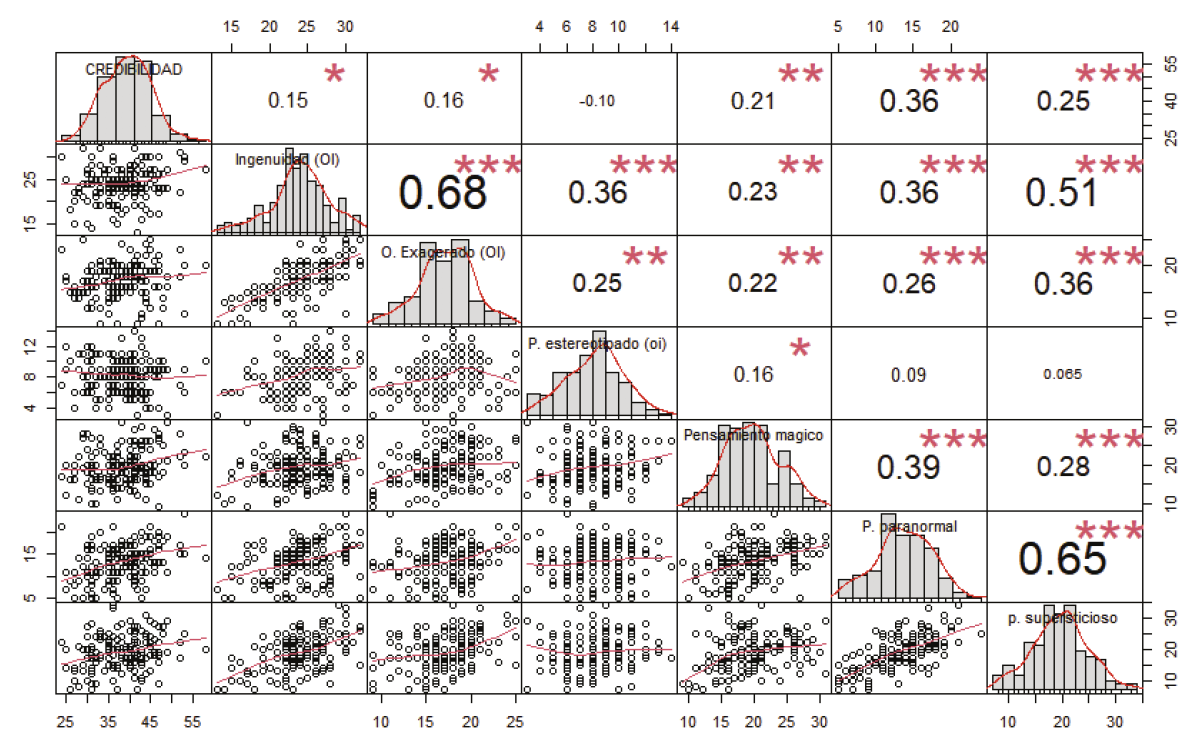 Naturalmente, también se hallaron correlaciones entre las facetas internas de las creencias disfuncionales, destacando los vínculos entre Ingenuidad y Optimismo Exagerado [r = 0.68 (169), p < 0.001], Creencias Paranormales y Pensamiento Supersticioso [r = 0.65 (169), p < 0.001] e Ingenuidad y Pensamiento Supersticioso [r = 0.51 (169), p < 0.001].