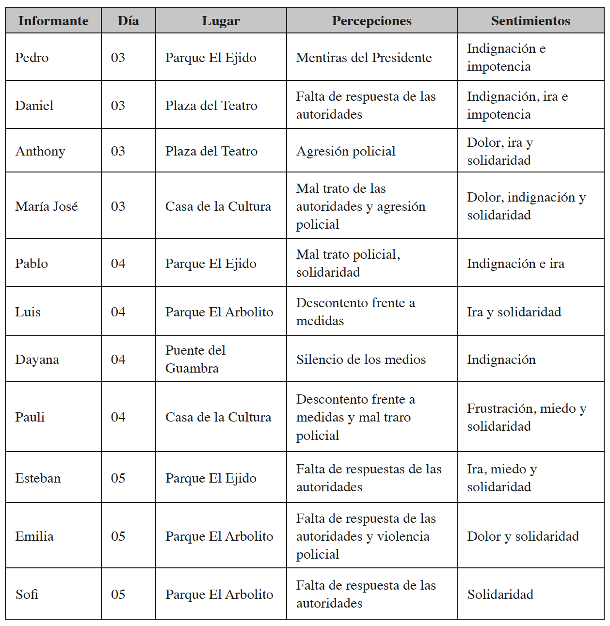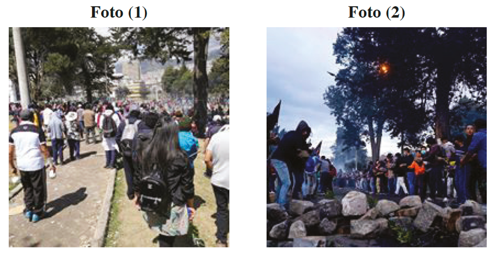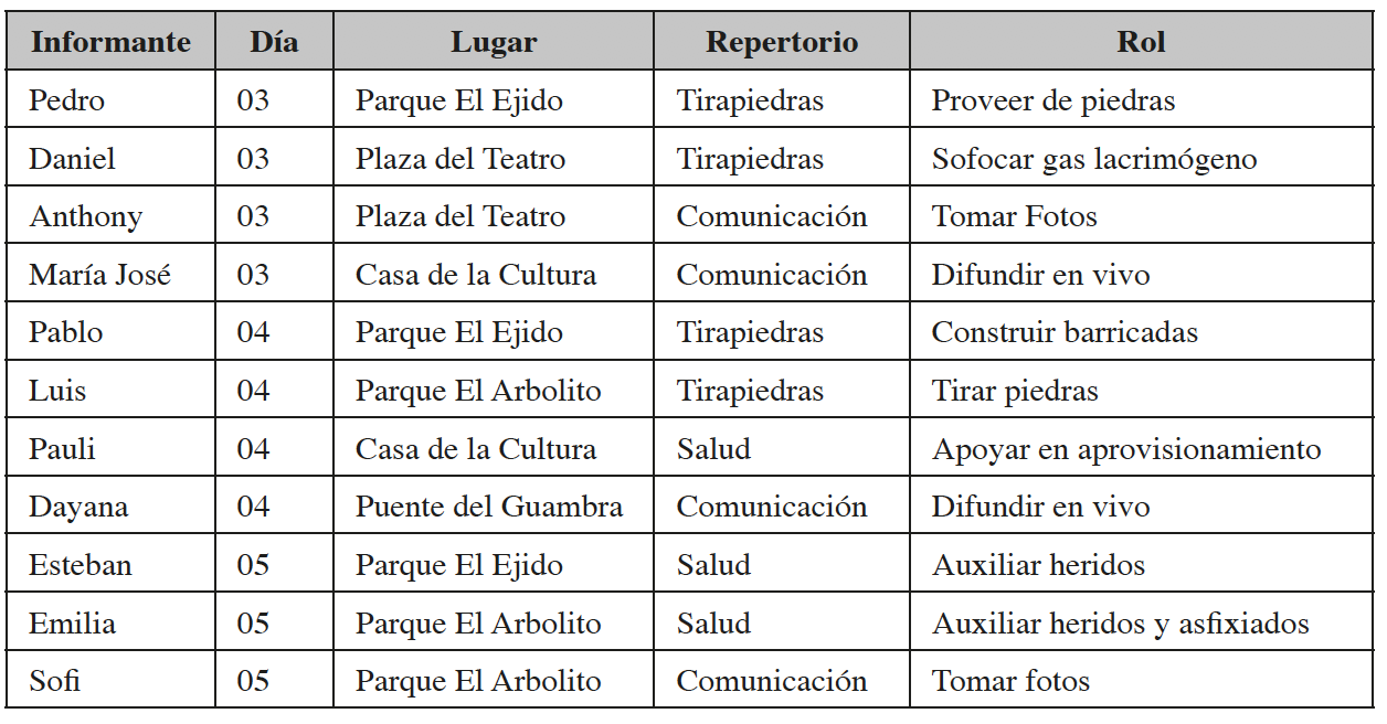 Así, se aplicaron inmersiones etnográficas en los puntos de concentración de los manifestantes, lo que permitió registrar el modo en que estos espacios fueron ocupados y el rol que diversos manifestantes jugaron dentro de ellos. Dentro de estos espacios se aplicaron entrevistas semi-estructuradas a doce manifestantes (seis hombres y seis mujeres), seleccionados por su presencia en: a) los enfrentamientos contra agentes de la policía, b) en los parques de El Ejido y El Arbolito, y c) en las inmediaciones entre la Casa de la Cultura y el Puente del Guambra. Adicionalmente, el análisis de noticias publicadas en medios digitales permite sustentar la cronología de sucesos, referenciar las expresiones del presidente de la República, resaltar los hechos que caracterizaron cada jornada y constatar la veracidad de las descripciones y relatos.