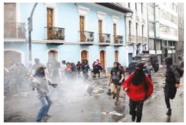 Sin embargo, a las 12h00 de ese mismo día, el Presidente de la República trasladaba la sede del Gobierno nacional a la ciudad de Guayaquil y, mientras la función legislativa permanecía cerrada, carrocerías blindadas del ejército y de la policía reforzaron los edificios de gobierno para impedir el avance de las marchas que llegaba por las calles aledañas. Los enfrentamientos se desencadenaron cuando los uniformados empezaron a desalojar a los manifestantes, empleando disparos permanentes de diverso tipo de proyectiles que emitían gas lacrimógeno, esquirlas expansivas y balas de goma: “estos explosivos parecen caseros, me acaban de herir en el brazo con fragmentos de hierro oxidado envuelto en cartón” (Luis, 24 años).