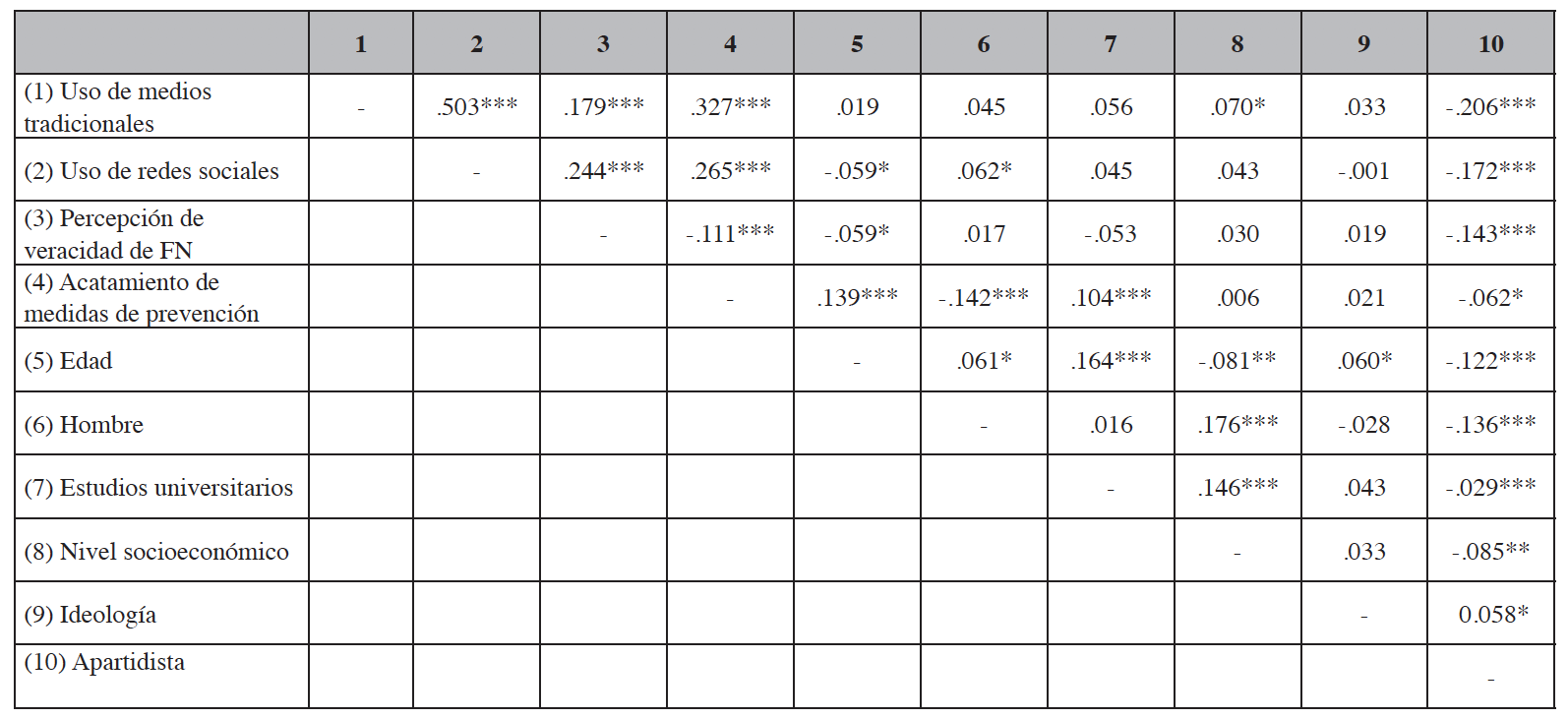 Por otra parte, trabajos más recientes sobre desinformación durante la crisis del coronavirus han pretendido elucidar cuáles son los predictores de percibir este contenido como verdadero. Calvillo et al. (2020) establecieron que ser de ideología conservadora es un predictor para tener menor capacidad de discernir correctamente entre noticias falsas y reales sobre la enfermedad, además para sentirse personalmente menos vulnerable al virus. Otras investigaciones se han enfocado en el rol del uso de redes sociales y la percepción de veracidad de información falsa sobre COVID-19 por parte del público. Los hallazgos de Jamieson y Albarracín (2020) apuntan que quienes reportan informarse en plataformas de redes sociales, entre la población estadounidense, están más desinformadas sobre el coronavirus y creen más información falsa. De manera similar en el contexto canadiense, Bridgman et al. (2020) señalan que quienes consumen más información noticiosa en medios tradicionales tienen menos nociones erróneas sobre el padecimiento, contrario a quienes se informan vía redes sociales, que creen más en la desinformación sobre la enfermedad COVID-19. Además, estos autores encontraron que, a su vez, creer en información falsa sobre la COVID-19 está vinculado con un menor acatamiento de las medidas de distanciamiento social.