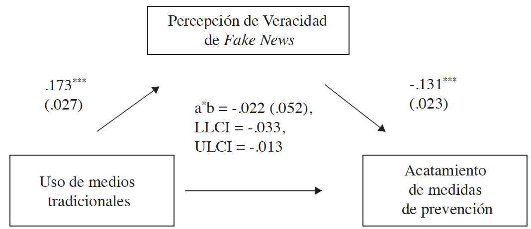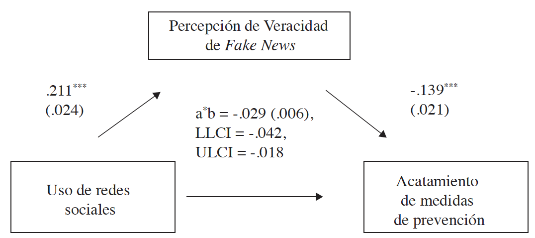 Estos hallazgos llevan a hacer las siguientes conclusiones sobre las hipótesis planteadas. Se acepta la hipótesis 1, ambos modelos indican una relación negativa entre creer fake news sobre COVID-19 y acatar las medidas de prevención de contagio. Se acepta también la hipótesis 2 al encontrarse que el uso de redes sociales es un predictor que impacta positivamente la percepción de creer en fake news. Por otro lado, los resultados muestran una relación positiva entre el uso de medios tradicionales y creer en fake news, por lo que la hipótesis 3 se rechaza. Respecto a la pregunta de investigación, tanto el modelo con redes sociales como variable independiente, como en el que tenía a medios tradicionales como predictora, se encontró un efecto indirecto significativo, en el que el impacto del uso de estos canales de información sobre el acatamiento de medidas de prevención de contagio estaba mediado por la variable de percepción de veracidad de fake news, contribuyendo en ambos casos el seguimiento de los canales de información a reducir el acatamiento de las medidas de seguridad a través de la creencia en la veracidad de fake news.