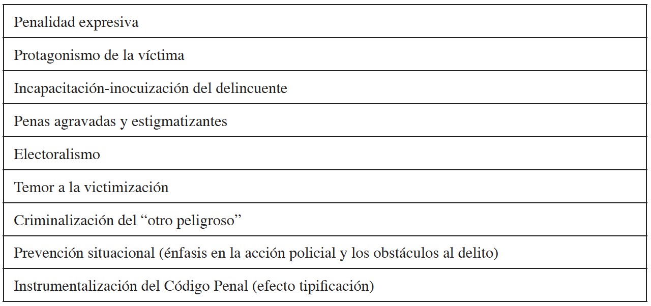 Por último, se puede realizar un sumario de los elementos fundamentales del populismo punitivo en una tabla como la siguiente. En ella se explicitan los ítems clave de este tipo de estrategia política.