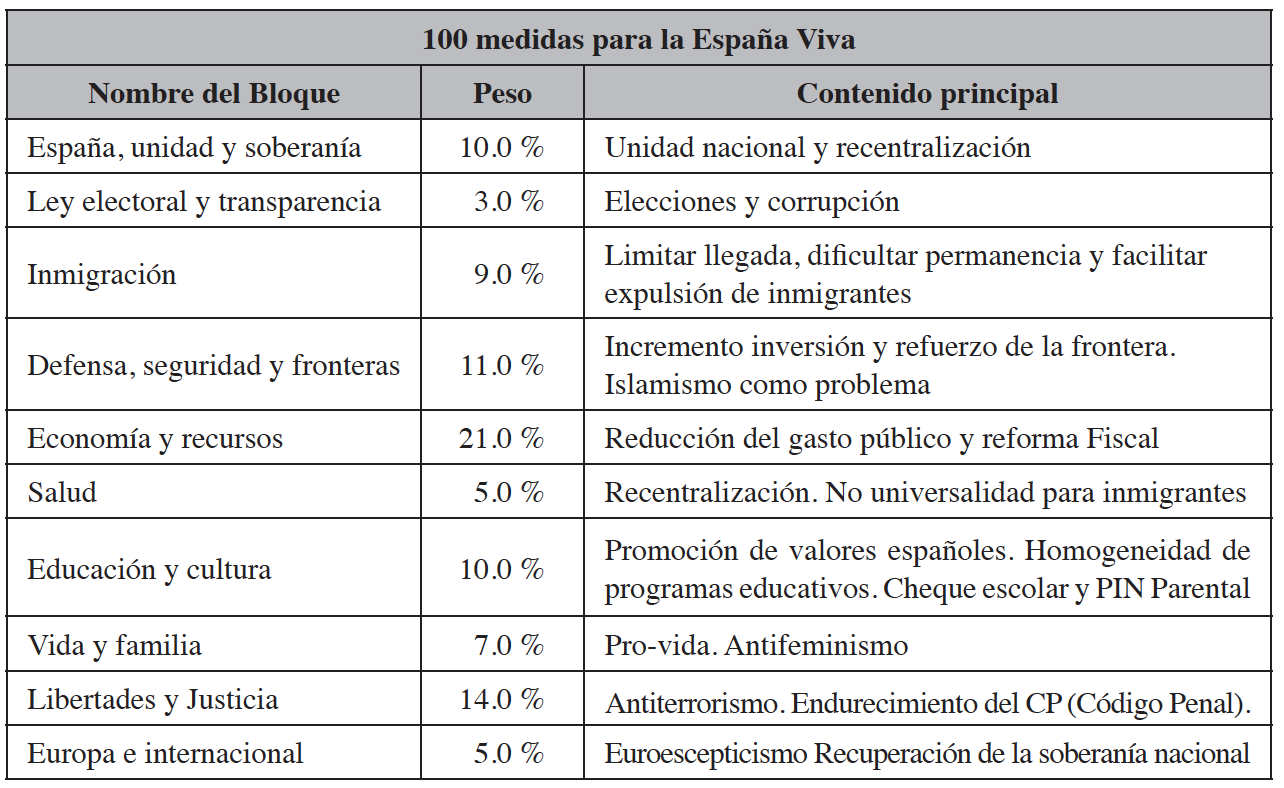En un marco meramente descriptivo, ya se aprecia, por un lado, la fuerte presencia de la inmigración como un tema casi transversal que es propio de la formación española. Casi la cuarta parte de las propuestas están dentro de la economía (21 %) lo que se explica por la situación de crisis socioeconómica que atraviesa el país desde 2008. La mayoría de las medidas se inscriben dentro de políticas de la ortodoxia neoliberal, tendente a crear un Estado de Bienestar residual (Esping-Andersen, 1996). Asimismo, hay que destacar que la presencia de medidas antiterroristas y en defensa de unidad nacional y la recentralización. En especial, para el tema objeto de este estudio, destacan las medidas como la 87, donde se alude explícitamente a la desaparecida banda terrorista ETA. Así como en las 84 y 85, en las que señala explícitamente a las víctimas de dicha organización violenta, al deber de ser homenajeadas, mantener su memoria y su dignidad. Esto tiene origen en la fundación del partido por personas víctimas del terrorismo de la citada organización. Además, su líder Santiago Abascal fue amenazado por la organización terrorista en el pasado. Asimismo, dicha banda tenía como fin último la independencia de los territorios vascos, lo cual es un desafío a la unidad nacional, un valor supremo para la formación de EDP. Esto explica el énfasis en el primer bloque sobre la unidad del Estado y las políticas de recentralización. Todo ello va en paralelo con una criminalización y condena rotunda de toda vía separatista, a tenor de lo manifestado en el punto 2 “Ilegalización de los partidos, asociaciones u ONG que persigan la destrucción de la unidad territorial de la Nación y su soberanía” (Vox, 2019, p. 1).