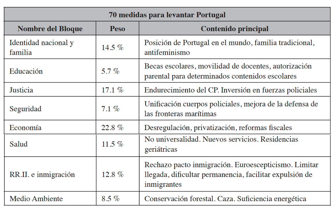 En lo que respecta a la formación portuguesa Chega!, su manifiesto lleva el nombre de “70 medidas para levantar Portugal”.[4]