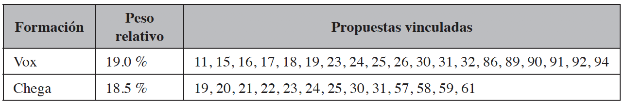 Como cierre a esta comparación, resta por señalar la existencia de varios paralelismos muy acusados entre ambas propuestas. Las propuestas 90 de Vox y la 21 de Chega! son prácticamente idénticas, al reivindicar la cadena perpetua para crímenes particularmente sensibles. Por otro lado, la propuesta 31 de la formación española es idéntica a la 22 de la lusa, aludiendo a la explicitación de la nacionalidad y origen de los delincuentes en las estadísticas criminales. Lo mismo ocurre en los casos de la medida 23 de Chega! y la 92 de Vox, que son prácticamente iguales, al solicitar la retirada de los beneficios penitenciarios para terroristas e inmigrantes ilegales, el enunciado literal es idéntico. Lo mismo ocurre en cuanto a las propuestas 58 (deportación de inmigrantes) y 59 (prohibición de regulación) de Chega! que son paralelas a las de Vox 14 y 15, para la primera, y a la 20 para la segunda. Todo esto no hace más que señalar las profundas concordancias entre ambas formaciones. Ello no resulta sorprendente dadas las similitudes socioeconómicas de ambos países vecinos y la situación parecida que han atravesado tras la Gran Recesión.
