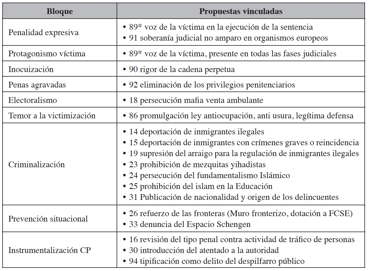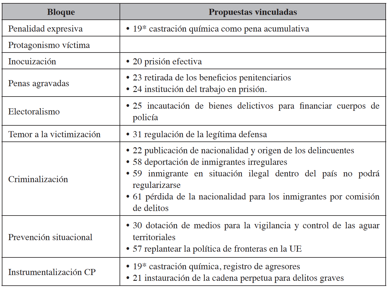 Al apreciar el contenido de la propuesta de la formación de EDP española con las nueve dimensiones del populismo punitivo, se aprecia que están presentes en su integridad. En primer lugar, cabe destacar la propuesta 89, dado que su redacción motiva su presencia en dos dimensiones de manera simultánea. Esto se justifica en que la redacción incide tanto en la presencia de la víctima como elemento protagónico en el proceso judicial como, de manera singular, en la sentencia. Esto último lo vincula profundamente a la idea de una penalidad expresiva, esencialmente en términos de resarcir y otorgar una satisfacción a la víctima. Desde el punto de vista cuantitativo, destaca el ítem de criminalización. Este implica la idea de la identificación de un “otro peligroso” como antagonista o imagen del outsider que focaliza los riesgos de victimización para los insiders. Para el caso que se analiza está completamente volcado con la figura del inmigrante, señaladamente aquel de credo islámico. Esto se debe tanto a la historia reciente del país, como a las presiones migratorias a las que se ha visto expuesta la frontera sur española. Lo anterior se vincula a la dimensión de la prevención situacional, que cuenta con dos propuestas que suponen el control y refuerzo de las fronteras exteriores.