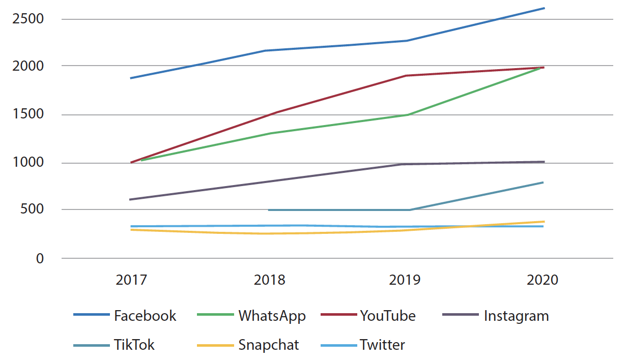 Las redes sociales en línea son parte de la cotidianidad de este siglo XXI, su variedad permite el uso para contextos laborales, académicos, relaciones románticas, conectar intereses comunes (Ellison et al., 2007); Facebook ha tenido el mayor número de usuarios desde antes de 2015 seguido por YouTube, WhatsApp, Instagram, recientemente por TikTok, además de Snapchat y Twitter (ver Figura 1).