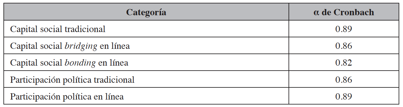 Para confirmar la validez del instrumento reflejada en la prueba piloto se realizó el análisis de fiabilidad con el total de la muestra. El instrumento en general mostró una α de Cronbach de 0.92. Al igual que en la prueba piloto se obtuvo la α por cada categoría, en donde las consistencias mayores fueron en capital social tradicional (0.89) y la participación política en línea (online) (0.89) (ver Tabla 1).