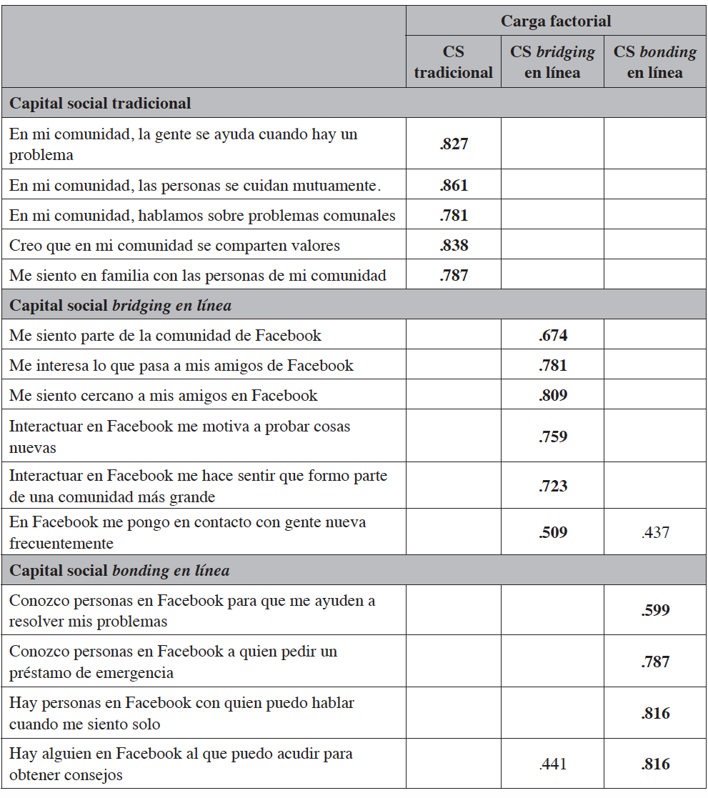 Las tres medidas de capital social se analizaron factorialmente para asegurar que había distinción en sus dimensiones: capital social tradicional, capital social en línea bridging y capital social en línea bonding explicando el 65.6 % de la varianza (ver Tabla 2).