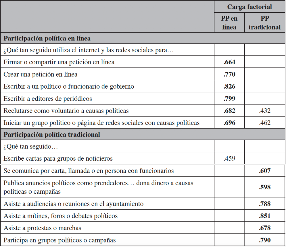 Este análisis factorial se realizó también a los ítems de participación política para asegurar distinción de dimensiones en sus categorías tradicional y en línea (online), explicando el 68.3 % de la varianza (Tabla 3).