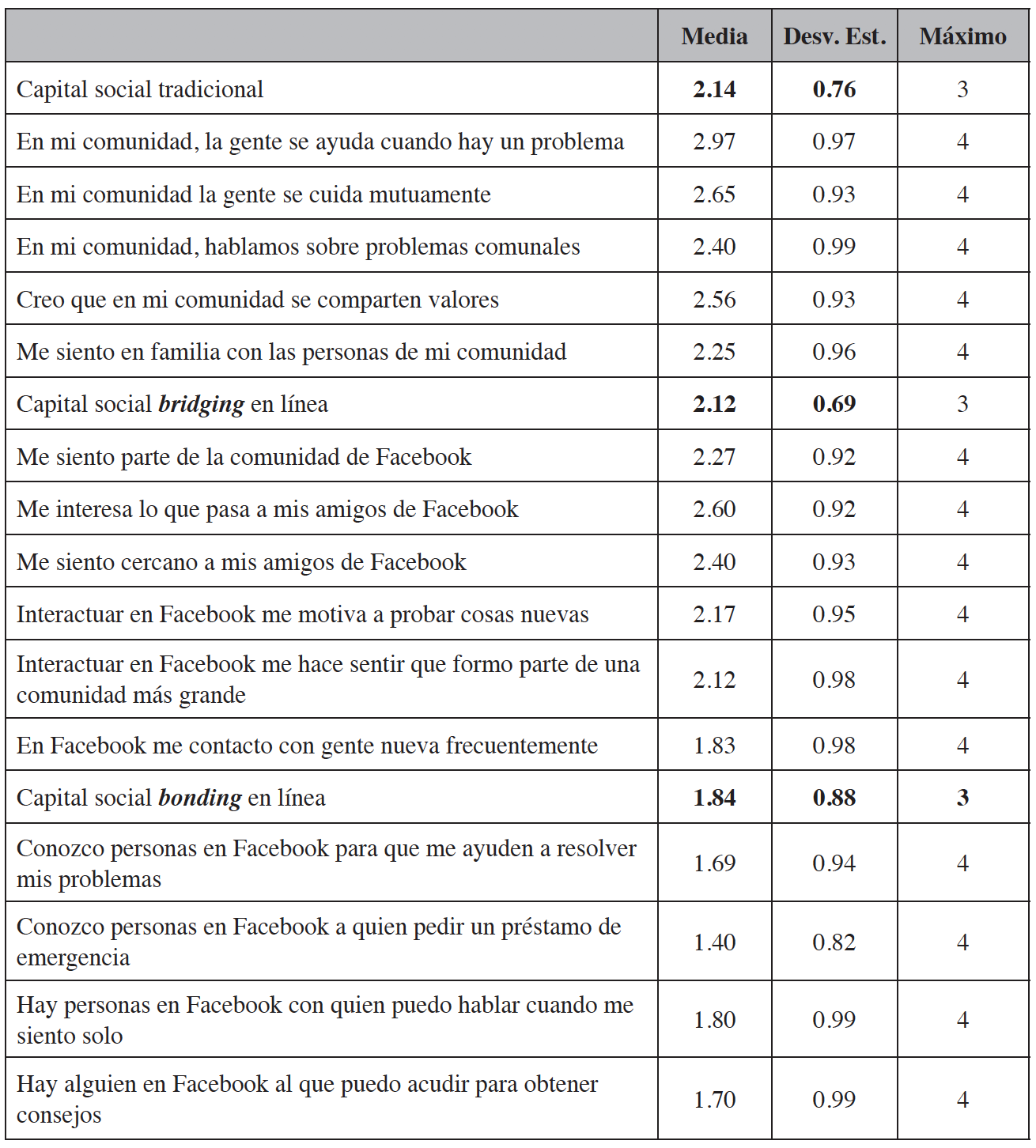 De los ítems de capital social, escalados a tres y por dimensiones, la dimensión con mayor puntaje resultó en su forma tradicional (m = 2.14, s = 0.76), seguida por el bridging en línea (m = 2.12, s = 0.69) y la más baja fue su dimensión en línea bonding (m = 1.84, s = 0.88) (ver Tabla 4). Eso no implica que sean promedios altos solo que los primeros dos indican mayores incidencias de nivel medio-alto.