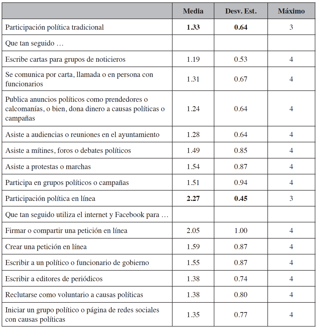 La siguiente categoría es la participación política dividida en tradicional y en línea. Es medida por la frecuencia de participación en actividades políticas en ambas modalidades y fueron retomadas de Gil de Zúñiga et. al. debido a su reincidencia en diversos artículos probando su validez (Gil de Zúñiga et al., 2012, 2014, 2017).