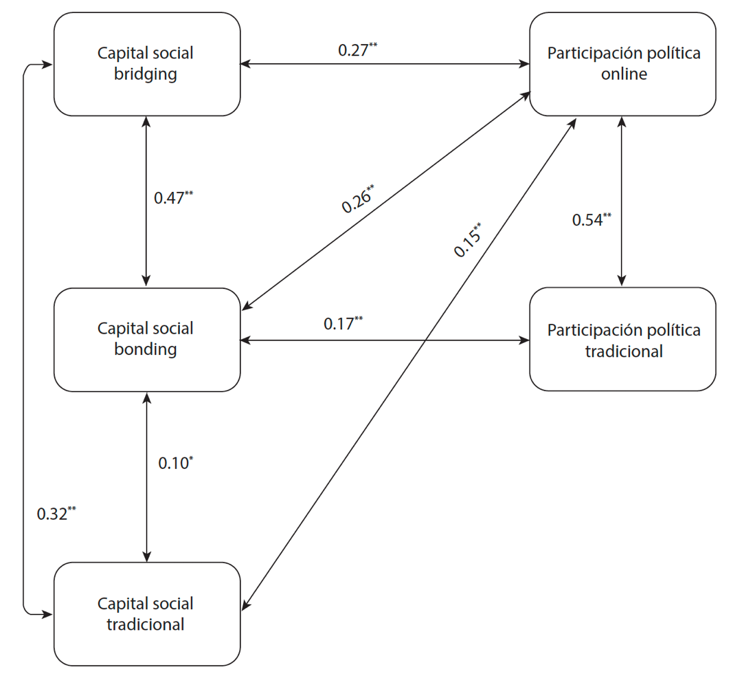 Cabe mencionar que la relación entre los dos tipos de participación política (tradicional y en línea) es buena (ρ=0.54; p<0.01), permitiendo influir a la tradicional indirectamente a través de la en línea. Incluso mejor que las encontradas entre las dimensiones de capital social, donde la mayor fue entre las dimensiones en línea bridging y bonding (ρ=0.47; p<0.01), seguido por el bridging y el tradicional (ρ=0.32; p<0.01), con el capital social tradicional y la dimensión bonding, aunque significativa, la relación fue más baja (ρ=0.10; p<0.05) (ver Figura 2).