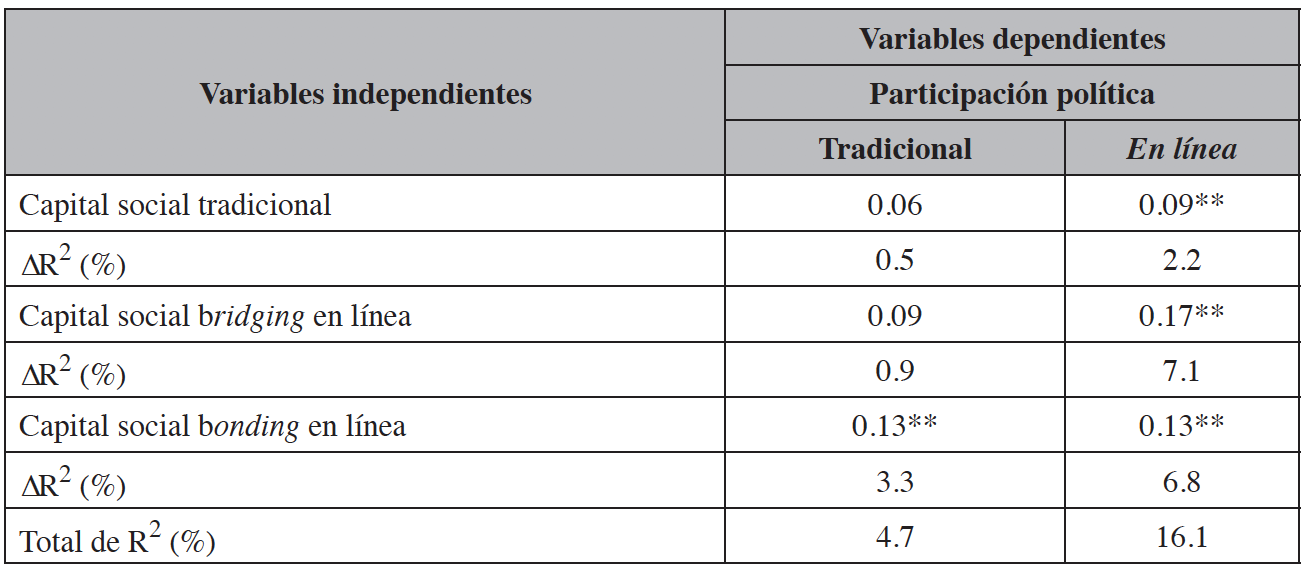 En cuanto al capital social tradicional no resultó influyente para la participación política tradicional (β = 0.06, p > 0.05) (H5), pero si para la participación política en línea (β = 0.09, p < 0.01) (H6) (ver Tabla 6).
