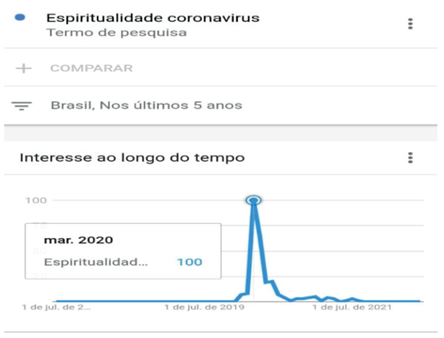 Por lo tanto, se nota que hubo un aumento significativo en las búsquedas de apoyo espiritual y religiosidad, según datos del sitio de búsqueda de tendencias de Google, la búsqueda del término: espiritualidad, aumentó durante la pandemia, especialmente en marzo de 2020, inicio de la pandemia, lo que puede justificarse por los diferentes estresores ya mencionados anteriormente, que se intensificaron con motivo de la pandemia. Obsérvese los datos en el gráfico 1: