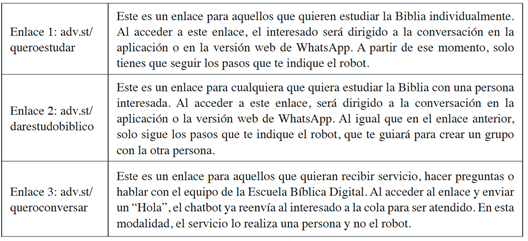 Este chatbot utiliza tecnología de inteligencia artificial y se puede acceder a través de un enlace disponible en sitios web de la denominación antes mencionada y en la red “Novo Tempo”, que dirige a aplicaciones de mensajería e interactúa con el usuario, ofreciendo orientación espiritual, consejería y estudios bíblicos, siendo una especie de instructor o profesor virtual. Según Fernandes (2019), existen tres enlaces básicos de acceso, como se muestra en la tabla 1: