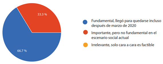 El 33,3 % de los encuestados considera que las prácticas en línea son importantes para el escenario, pero no fundamentales, a diferencia del 66,7 % que las considera como acciones que han venido para quedarse en la cotidianidad del estudio bíblico.