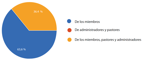 El gráfico 5 muestra que el 100 % de los participantes está de acuerdo en que los miembros de la iglesia podrían/deberían ser escuchados sobre bases importantes/relevantes que el chatbot debería abordar. Sin embargo, el 36,4% de estos cree que además de los miembros, en general, deben participar los pastores y administradores.