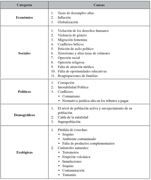 Ahora bien, entre las razones identificadas que motivan este accionar, existen al menos cinco categorías que la justifican y que son la económica, social, política, demográfica y ecológica. Por ello, para comprender mejor el fenómeno migratorio, esta investigación pretende identificar y describir los motivos más frecuentes relacionados con el tema de estudio, de acuerdo con la literatura disponible. Por tanto, a continuación, se presenta una revisión bibliográfica profunda de los temas mencionados.