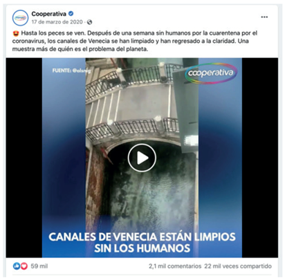 Esto podríamos verlo ejemplificado en la imagen 3, donde se puede observar la narrativa XYSDO, que obtuvo la mayor seminalidad de la muestra para Facebook. Primero, tiene una expresión (“Hasta los peces se ven”); luego, el por qué (“Después de una semana sin humanos por la cuarentena por el coronavirus”); la consecuencia (“los canales (…) se han limpiado y han regresado a la claridad”); y el dónde (“de Venecia”). Termina con un juicio de valor que, en este caso, no se explicita como opinión: “Una muestra más de quién es el problema del planeta”. En rigor, este post tiene sólo dos datos periodísticos, pero agrega marcas retóricas (expresión y opinión) y connotativas (consecuencia).[1]