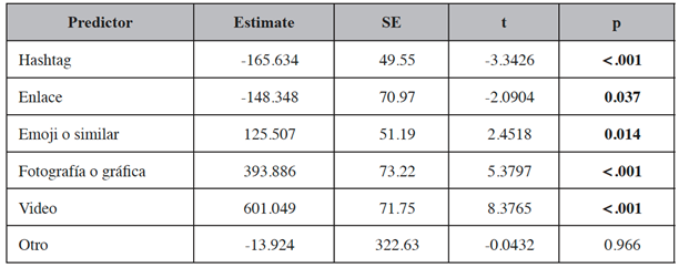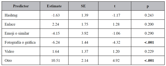 Las tablas 9 y 10 muestran que en Facebook todos los recursos, excepto el “otro”, tienen una incidencia significativa con respecto a la seminalidad, lo que confirma la idea de que la participación se incrementa en respuestas con contenidos que entrañan un mayor esfuerzo creativo (Kaplan y Haenlein, 2010). Mientras que, en Twitter, probablemente por su brevedad e inmediatez, solo se asocia la seminalidad con las narrativas que contienen fotografías y el “otro” tipo de recursos.