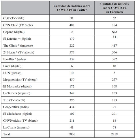 Además, es importante destacar que Facebook, a pesar de ser la principal fuente de noticias para los chilenos y chilenas hace varios años, tuvo un 43 % menos de noticias sobre la COVID-19 que Twitter, considerando los mismos medios de comunicación y al inicio de la crisis. Esta es la primera señal de que los hábitos de consumo están siendo ignorados con relación a la oferta informativa.