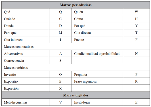 La matriz (tabla 2) divide las marcas lingüísticas en cuatro tipos. Las marcas periodísticas tradicionales incluyen las 6 W clásicas del periodismo informativo de corte anglosajón, que equivale al qué, quién, cómo, cuándo, dónde y por qué, que predominan en la narrativa de la pirámide invertida, muy difundida en Chile a través de las escuelas de periodismo (Hernández Osuna, 2016). A estas marcas se agrega el para qué y también la técnica de dar voz a las fuentes, que participan en el discurso citadas de forma directa, indirecta o con una paráfrasis que identifica al emisor del discurso.
