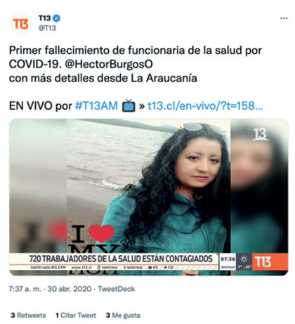 Por ejemplo, el post que se muestra en la imagen 1, posee la narrativa QWYVDV, por cuanto la secuencia identifica el qué (“primer fallecimiento”); el quién (“funcionaria de salud”), que en este caso constituye en sí el valor distintivo de la noticia; y el por qué (“por COVID-19”). Luego introduce un recurso metadiscursivo sobre la cobertura (“@HectorBurgosO con más detalles”), el dónde (“La Araucanía”) y una nueva marca metadiscursiva al cierre (“En vivo por #T13AM”).