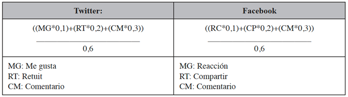Para cada unidad se midió la seminalidad, que calcula la capacidad de un discurso periodístico digital de incitar las aportaciones discursivas de las audiencias, ponderando cada respuesta posible según su grado de exposición y esfuerzo creativo, desde el me gusta de Twitter o las reacciones de Facebook, el nivel más bajo, hasta los comentarios, que se consideran la manera más expuesta y dedicada de participación discursiva en el flujo noticioso de las redes sociales digitales (tabla 3):